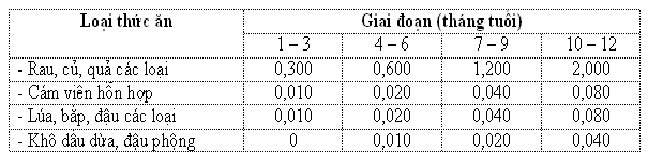 * Khẩu phần thức ăn cơ bản hàng ngày theo từng giai đoạn: